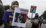 Sejumlah massa aksi melaksanakan unjuk rasa di kawasan Patung Kuda, Jakarta, Selasa (8/3/2022). Unjuk rasa dalam rangka memperingati Hari Perempuan Internasional itu menuntut pemerintah untuk mewujudkan sistem perlindungan sosial yang tidak diskriminatif dan segera mengesahkan RUU TPKS yang pro terhadap korban kekerasan. (FOTO : Republika/Putra M. Akbar)