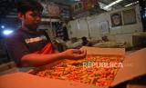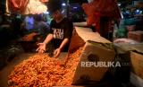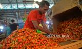 Pedagang memilah cabai rawit merah di Pasar Induk Kramat Jati, Jakarta, Selasa (8/3/2022). Harga cabai rawit merah di pasar tersebut mengalami kenaikan dari harga normal Rp 35.000 per kilogram, saat ini harga cabai rawit merah mencapai Rp 55.000 hingga Rp 60.000 per kilogram karena dipicu pasokan yang menurun akibat cuaca buruk di sejumlah daerah penghasil. Prayogi/Republika. (FOTO : Prayogi/Republika)
