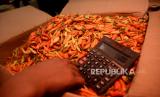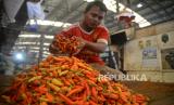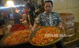 Pedagang menunjukan cabai rawit merah di Pasar Induk Kramat Jati, Jakarta, Selasa (8/3/2022). Harga cabai rawit merah di pasar tersebut mengalami kenaikan dari harga normal Rp 35.000 per kilogram, saat ini harga cabai rawit merah mencapai Rp 55.000 hingga Rp 60.000 per kilogram karena dipicu pasokan yang menurun akibat cuaca buruk di sejumlah daerah penghasil.   (FOTO : Prayogi/Republika)