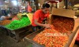 Pedagang menata cabai rawit merah di Pasar Induk Kramat Jati, Jakarta, Selasa (8/3/2022). Harga cabai rawit merah di pasar tersebut mengalami kenaikan dari harga normal Rp 35.000 per kilogram, saat ini harga cabai rawit merah mencapai Rp 55.000 hingga Rp 60.000 per kilogram karena dipicu pasokan yang menurun akibat cuaca buruk di sejumlah daerah penghasil. Prayogi/Republika. (FOTO : Prayogi/Republika)
