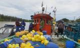 Ditpolairud Polda Aceh bersama petugas pangkalan Pengawasan Sumberdaya Kelautan dan Perikanan (PSDKP) di daerah itu menangkap kapal ikan berbendera India beserta delapan ABK , diduga melakukan pencurian ikan di perairan Pantai Barat Provinsi Aceh. ANTARA FOTO/Ampelsa/t