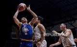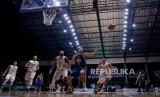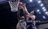 Pebasket Dewa United Surabaya Ferdian Dwi Purwoko (tengah) berusaha merebut bola saat melawan tim Satria Muda Pertamina Jakarta dalam pertandingan lanjutan Indonesia Basket League (IBL) 2022 di Hall Basket Senayan, kompleks Stadion Utama Gelora Bung Karno (SUGBK), Jakarta, Rabu (9/3/2022). Dewa United Surabaya berhasil kalahkan Satria Muda Pertamina Jakarta dengan skor 60-55. (FOTO : Republika/Thoudy Badai)