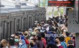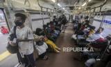 Sejumlah penumpang menaiki KRL di Stasiun Tanah Abang, Jakarta, Rabu (9/3/2022). Pemerintah memberlakukan peraturan baru menaiki KRL yaitu tempat duduk tanpa jarak, peningkatan kapasitas hingga 60 persen, balita dibolehkan naik dengan didampingi orang tua, wajib memakai masker, dilarang berbicara dan sudah divaksin Covid-19. (FOTO : Republika/Putra M. Akbar)