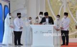 Presiden Joko Widodo menandatangani prasasti saat meresmikan Masjid At-Thohir di Tapos, Kota Depok, Jawa Barat Rabu (9/3/2022). Masjid dengan gaya arsitektur Timur Tengah ini akan menjadi sarana dakwah dan ibadah bagi umat Islam. Peletakan batu pertama Masjid At-Thohir telah dilakukan sejak 31 Maret 2018 oleh Wakil Presiden Jusuf Kalla, yang juga merupakan Ketua Dewan Masjid Indonesia (DMI). (FOTO : Republika/Edwin Dwi Putranto)