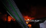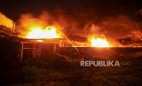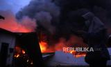 REPUBLIKA.CO.ID, SIDOARJO -- Petugas pemadam kebakaran berusaha memadamkan api yang membakar pabrik sepatu di kawasan Wadungasri, Waru, Sidoarjo, Jawa Timur, Rabu (9/3/2022). Sebanyak sembilan unit mobil Pemadam Kebakaran (PMK) dikerahkan ke lokasi tersebut, dan petugas masih menyelidiki penyebab kebakaran.