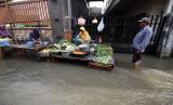 Pedagang berjualan meski banjir menggenangi pasar di Desa Wedoro, Waru, Sidoarjo, Jawa Timur, Jumat (11/3/2022). Curah hujan tinggi dan daya tampung sungai yang belum maksimal serta drainase yang buruk mengakibatkan banjir menggenangi ruas jalan dan permukiman warga di sejumlah lokasi di Sidoarjo (FOTO : ANTARA/Umarul Faruq)