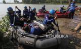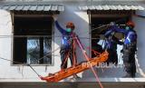 REPUBLIKA.CO.ID, SURABAYA -- Sejumlah anggota Barisan Reaksi Cepat (Baret) Rescue NasDem mengevakuasi korban bencana di ketinggian saat simulasi penanganan bencana di Wisata Edukasi Gondang Outbond (WEGO), Kabupaten Lamongan, Jawa Timur, Jumat (11/3/2022). Simulasi itu merupakan rangkaian penutupan sekaligus pembaretan 156 peserta Diklat SAR Baret Rescue NasDem.