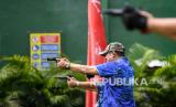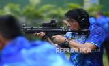 Komedian Eddy Soepono alias Parto (kiri) membidik sasaran saat akan mengikuti Lomba Menembak Piala Komandan Pasukan Pengamanan Presiden (Danpaspampres) 2022 dalam kelas ekshibisi Dueling Plate di Lapangan Tembak Senayan, Jakarta, Ahad (13/3/2022). (FOTO : Antara/M Risyal Hidayat)