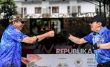 Ketua MPR Bambang Soesatyo (kiri) berjabat tangan tos dengan Menteri Hukum dan HAM Yasonna Laoly (kanan) usai mengikuti Lomba Menembak Piala Komandan Pasukan Pengamanan Presiden (Danpaspampres) 2022 dalam kelas ekshibisi Dueling Plate di Lapangan Tembak Senayan, Jakarta, Ahad (13/3/2022). (FOTO : Antara/M Risyal Hidayat)