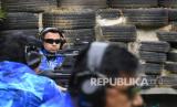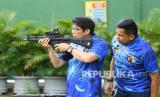 Selebritas Raffi Ahmad (kiri) bersiap mengikuti Lomba Menembak Piala Komandan Pasukan Pengamanan Presiden (Danpaspampres) 2022 dalam kelas ekshibisi Dueling Plate di Lapangan Tembak Senayan, Jakarta, Ahad (13/3/2022). (FOTO : Antara/M Risyal Hidayat)
