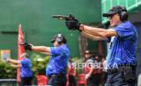 Ketua MPR Bambang Soesatyo (kanan) membidik sasaran saat mengikuti Lomba Menembak Piala Komandan Pasukan Pengamanan Presiden (Danpaspampres) 2022 dalam kelas ekshibisi Dueling Plate di Lapangan Tembak Senayan, Jakarta, Ahad (13/3/2022). (FOTO : Antara/M Risyal Hidayat)
