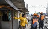 Petugas PT KAI Daop 1 Jakarta berbincang dengan warga saat sosialisasi dalam rangka penertiban bangunan liar di sekitar lintasan kereta api di Stasiun Ancol hingga Stasiun Tanjung Priok, Jakarta, Senin (14/3/2022). PT KAI Daop 1 Jakarta bersama unsur kewilayahan setempat secara bertahap menertibkan sekitar 326 bangunan liar dan mengimbau warga sekitar untuk menaati peraturan demi keselamatan bersama, menjaga lingkungan di sekitar jalur rel bersih dan keamanan perjalanan kereta api. (FOTO : ANTARA/M Risyal Hidayat)