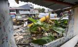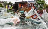 Warga berusaha merapikan barang miliknya saat berlangsungnya penertiban bangunan liar di sekitar lintasan kereta api di Stasiun Ancol hingga Stasiun Tanjung Priok, Jakarta, Senin (14/3/2022). PT KAI Daop 1 Jakarta bersama unsur kewilayahan setempat secara bertahap menertibkan sekitar 326 bangunan liar dan mengimbau warga sekitar untuk menaati peraturan demi keselamatan bersama, menjaga lingkungan di sekitar jalur rel bersih dan keamanan perjalanan kereta api. (FOTO : ANTARA/M Risyal Hidayat)