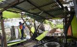 Petugas PT KAI Daop 1 Jakarta berusaha merobohkan bangunan saat penertiban bangunan liar di sekitar lintasan kereta api di Stasiun Ancol hingga Stasiun Tanjung Priok, Jakarta, Senin (14/3/2022). PT KAI Daop 1 Jakarta bersama unsur kewilayahan setempat secara bertahap menertibkan sekitar 326 bangunan liar dan mengimbau warga sekitar untuk menaati peraturan demi keselamatan bersama, menjaga lingkungan di sekitar jalur rel bersih dan keamanan perjalanan kereta api. (FOTO : ANTARA/M Risyal Hidayat)
