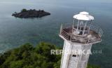 Foto udara bangunan mercusuar peninggalan Belanda di Pulau Labengki, Konawe Utara, Sulawesi Tenggara, Minggu (13/3/2022). Pulau Labengki menjadi salah satu destinasi unggulan Sulawesi Tenggara karena panorama alamnya dan juga terdapat mercusuar peninggalan Belanda yang menjadi salah satu spot favorit bagi wisatawan. (FOTO : Antara/Jojon)