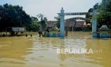 Warga bermain di depan sekolah yang tergenang air di Desa Cingrong, Purwodadi, Grobogan, Jawa Tengah, Rabu (16/3/2022). Akibat intensitas hujan yang tinggi serta meluapnya Sungai Serang menyebabkan ratusan rumah, beberapa sekolah serta jalan utama di desa itu terendam banjir. (FOTO : Antara/Yusuf Nugroho)