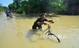 REPUBLIKA.CO.ID,GROBOGAN -- Warga melintas di jalan yang tergenang air di Desa Cingrong, Purwodadi, Grobogan, Jawa Tengah, Rabu (16/3/2022).