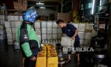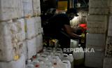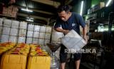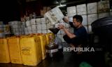 Pedagang menuangkan minyak curah kedalam jerigen milik pembeli di gerainya di kawasan Fatmawati, Jakarta, Rabu (16/3/2022). Menteri Perdagangan menerbitkan aturan kenaikan Harga Eceran Tertinggi (HET) minyak goreng curah jadi Rp14.000 per liter yang sebelumnya Rp11.500 yang berlaku sejak Rabu (16/3/2022). (FOTO : Republika/Thoudy Badai)