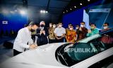 Presiden Joko Widodo (kiri) menandatangani mobil listrik Ioniq 5 di Pabrik Hyundai Motor Manufacturing Indonesia di Bekasi, Jawa Barat, Rabu (16/3/2022). Presiden Joko Widodo meresmikan pabrik Hyundai Motor Manufacturing Indonesia yang berada di Bekasi, Jawa Barat, pada hari ini Rabu (16/3/2022) sekaligus meresmikan peluncuran mobil listrik Ioniq 5 pertama yang dibuat di Indonesia. (FOTO : ANTARA FOTO/Biro Pers, Media dan Informasi )