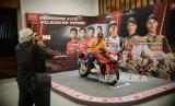 Warga berfoto di replika kendaraan motor di Bandara Udara Internasional Lombok Zainudin Abdul Madjid, Kabupaten Lombok Tengah, Nusa Tenggara Barat, Kamis (17/3/2022). Berbagai pernak pernik motoGP mulai memenuhi area Bandara Udara Internasional Lombok jelang gelaran MotoGP Pertamina Grand Prix of Indonesia yang akan berlangsung pada 18-20 Maret 2022 mendatang. Republika/Thoudy Badai (FOTO : Republika/Thoudy Badai)