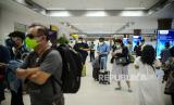 Penumpang beraktivitas di Bandara Udara Internasional Lombok Zainudin Abdul Madjid, Kabupaten Lombok Tengah, Nusa Tenggara Barat, Kamis (17/3/2022). Berbagai pernak pernik motoGP mulai memenuhi area Bandara Udara Internasional Lombok jelang gelaran MotoGP Pertamina Grand Prix of Indonesia yang akan berlangsung pada 18-20 Maret 2022 mendatang. Republika/Thoudy Badai (FOTO : Republika/Thoudy Badai)