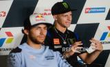 Pembalap Monster Energy Yamaha Fabio Quartararo (kanan) bersama Pembalap Gresini Racing MotoGP Enea Bastianini (kiri) menjawab pertanyaan wartawan saat sesi konferensi pers jelang gelaran motoGP di Pertamina Mandalika International Street Circuit, Lombok Tengah, NTB, Kamis (17/3/2022). Republika/Thoudy Badai (FOTO : Republika/Thoudy Badai)