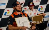 Pembalap Repsol Honda Team Pol Espargaro menjawab pertanyaan wartawan saat sesi konferensi pers jelang gelaran motoGP di Pertamina Mandalika International Street Circuit, Lombok Tengah, NTB, Kamis (17/3/2022). Republika/Thoudy Badai (FOTO : Republika/Thoudy Badai)
