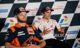 REPUBLIKA.CO.ID,LOMBOK TENGAH -- Pembalap Repsol Honda Team Marc Marquez (kanan) dan pembalap Red Bull KTM Factory Racing Brad Binder (kiri) menjawab pertanyaan wartawan saat sesi konferensi pers jelang gelaran motoGP di Pertamina Mandalika International Street Circuit, Lombok Tengah, NTB, Kamis (17/3/2022).
