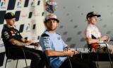 Pembalap Gresini Racing MotoGP Enea Bastianini (tengah) bersama, pembalap Monster Energy Yamaha Fabio Quartararo (kiri) dan pembalap Repsol Honda Team Pol Espargaro (kanan) saat sesi konferensi pers jelang gelaran motoGP di Pertamina Mandalika International Street Circuit, Lombok Tengah, NTB, Kamis (17/3/2022). Republika/Thoudy Badai (FOTO : Republika/Thoudy Badai)