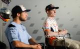 Pembalap Gresini Racing MotoGP Enea Bastianini (kiri) bersama pembalap Repsol Honda Team Pol Espargaro (kanan) saat sesi konferensi pers jelang gelaran motoGP di Pertamina Mandalika International Street Circuit, Lombok Tengah, NTB, Kamis (17/3/2022). Republika/Thoudy Badai (FOTO : Republika/Thoudy Badai)