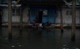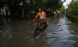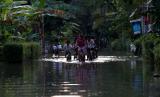REPUBLIKA.CO.ID,PURWOREJO -- Warga beraktivitas di jalan yang tergenang banjir di kawasan Butuh, Purworejo, Jawa Tengah, Kamis (17/3/2022).