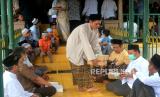 Pengurus masjid membagikan berkat atau makanan kepada warga saat nyadran di Masjid Pathok Negoro Plosokuning, Sleman, Yogyakarta, Jumat (18/3/2022). Tradisi Nyadran biasa dilakukan warga di Plosokuning jelang Ramadhan. Usai shalat Jumat warga membawa berbagai makanan dan dilanjutkan berdoa bersama mendoakan leluhur di masjid. Makanan yang dibawa kemudian dibagikan kepada warga yang ikut Nyadran. (FOTO : Wihdan Hidayat / Republika)