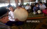 Penampilan Terbang atau Hadrah dari jamaah laki-laki saat nyadran di Masjid Pathok Negoro Plosokuning, Sleman, Yogyakarta, Jumat (18/3/2022). Tradisi Nyadran biasa dilakukan warga di Plosokuning jelang Ramadhan. Usai shalat Jumat warga membawa berbagai makanan dan dilanjutkan berdoa bersama mendoakan leluhur di masjid. Makanan yang dibawa kemudian dibagikan kepada warga yang ikut Nyadran. (FOTO : Wihdan Hidayat / Republika)
