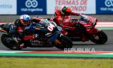Pembalap WithU Yamaha RNF MotoGP Team Andrea Dovizioso (kiri), pembalap Ducati Lenovo Team, Franceaco Bagnia (kanan) memacu sepeda motornya saat sesi latihan bebas 1 MotoGP seri Pertamina Grand Prix of Indonesia 2022 di Pertamina Mandalika International Street Circuit, Lombok Tengah, NTB, Jumat (18/3/2022). Seri Pertamina Grand Prix of Indonesia 2022 diawali dengan latihan bebas atau free practice selama 45 menit sebelum berlaga pada Ahad (20/3/2022) mendatang. Republika/Thoudy Badai (FOTO : Republika/Thoudy Badai)