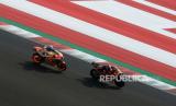 Pembalap Repsol Honda Team Marc Marquez (kiri), pembalap Red Bull KTM Factory Racing Brad Binder (kanan) memacu sepeda motornya saat sesi latihan bebas 1 MotoGP seri Pertamina Grand Prix of Indonesia 2022 di Pertamina Mandalika International Street Circuit, Lombok Tengah, NTB, Jumat (18/3/2022). Seri Pertamina Grand Prix of Indonesia 2022 diawali dengan latihan bebas atau free practice selama 45 menit sebelum berlaga pada Ahad (20/3/2022) mendatang. Republika/Thoudy Badai (FOTO : Republika/Thoudy Badai)