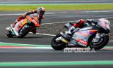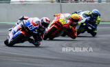 Pembalap Red Bull KTM Ajo, Pedro Acosta (kiri) memacu kecepatan saat sesi latihan bebas moto2 dalam seri Pertamina Grand Prix of Indonesia 2022 di Pertamina Mandalika International Street Circuit, Lombok Tengah, NTB, Jumat (18/3/2022). Seri Pertamina Grand Prix of Indonesia 2022 diawali dengan latihan bebas atau free practice selama 40 menit sebelum berlaga pada Ahad (20/3/2022) mendatang.Republika/Thoudy Badai (FOTO : Republika/Thoudy Badai)