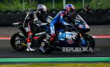 Pembalap Liqui Moly Intact GP, Jeremy Alcoba (kiri) dan pembalap Italtrans Racing Team (kanan) saat sesi latihan bebas moto2 dalam seri Pertamina Grand Prix of Indonesia 2022 di Pertamina Mandalika International Street Circuit, Lombok Tengah, NTB, Jumat (18/3/2022). Seri Pertamina Grand Prix of Indonesia 2022 diawali dengan latihan bebas atau free practice selama 40 menit sebelum berlaga pada Ahad (20/3/2022) mendatang.Republika/Thoudy Badai (FOTO : Republika/Thoudy Badai)