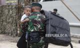 Prajurit Raider menggendong anaknya usai mengikuti upacara pengantaran Satgas Satuan Organik Papua Yonif Raider 142/Ksatria Jaya di Pelabuhan Boom Baru Palembang, Sumatera Selatan, Jumat (18/3/2022). Sebanyak 400 prajurit Yonif 142/Ksatria Jaya diberangkatkan menuju Papua dengan menggunakan KRI Teluk Bintuni-520 untuk menjalankan tugas menjaga keamanan bersama dengan satuan-satuan lainnya selama sembilan bulan. (FOTO : ANTARA/Nova Wahyudi)