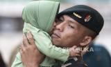 REPUBLIKA.CO.ID, PALEMBANG -- Prajurit Raider mencium anaknya usai mengikuti upacara pengantaran Satgas Satuan Organik Papua Yonif Raider 142/Ksatria Jaya di Pelabuhan Boom Baru Palembang, Sumatera Selatan, Jumat (18/3/2022).