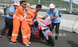 Sejumlah marshall membawa sepeda motor pembalap Gresini Racing MotoGP Enea Bastianini usai kecelakaan pada sesi latihan bebas 2 MotoGP seri Pertamina Grand Prix of Indonesia 2022 di Pertamina Mandalika International Street Circuit, Lombok Tengah, NTB, Jumat (18/3/2022). Ajang balapan MotoGP seri kedua 2022 tersebut berlangsung pada 18-20 Maret 2022. (FOTO : ANTARA/Andika Wahyu)