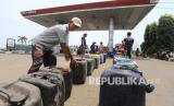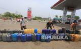 REPUBLIKA.CO.ID, INDRAMAYU -- Nelayan mengumpulkan jerigen untuk melakukan pengisian bahan bakar solar bersubsidi di SPBU Limbangan, Juntinyuat, Indramayu, Jawa Barat, Sabtu (19/3/2022). Nelayan terpaksa mengantre membeli BBM untuk kebutuhan melaut karena bahan bakar solar subsidi di sejumlah SPBU di daerah itu cepat habis.