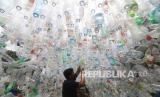 Relawan Ecological Observation and Wetlands Conservation (Ecoton) mengaitkan botol plastik bekas saat pembuatan instalasi gua plastik di Kelurahan Tempurejo, Kota Kediri, Jawa Timur, Sabtu (19/3/2022). Instalasi gua plastik yang terbuat dari 3.370 botol plastik bekas hasil pungutan dari Sungai Brantas tersebut bertujuan untuk mengampanyekan bahaya penggunaan plastik sekali pakai yang mengotori sungai-sungai Indonesia. (FOTO : Antara/Prasetia Fauzani)