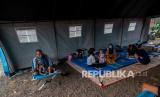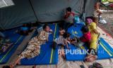 REPUBLIKA.CO.ID, PANDEGLANG -- Warga beristirahat di tenda pengungsian di Desa Teluk Labuan, Pandeglang, Banten, Sabtu (19/3/2022). Berdasarkan data sementara Tagana Kabupaten Pandeglang, sebanyak 50 KK korban bencana banjir terpaksa mengungsi karena rumahnya terendam lumpur setebal satu meter.