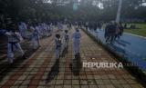 Warga saat latihan taekwondo di Taman Sempur, Kota Bogor, Jawa Barat, Ahad (20/3/2022). Taman Sempur ramai dikunjungi warga yang ingin berolahraga pada akhir pekan pasca dibukanya kembali untuk umum pada masa PPKM level 2 setelah dua tahun ditutup akibat pandemi Covid-19. Republika/Putra M. Akbar (FOTO : Republika/Putra M. Akbar)