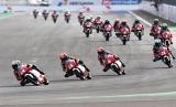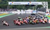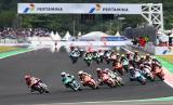 Sejumlah pembalap melaju saat balapan Moto3 seri Pertamina Grand Prix of Indonesia di Pertamina Mandalika International Street Circuit, Lombok Tengah, NTB, Ahad (20/3/2022). Pembalap Leopard Racing Italia Dennis Foggia berhasil menjadi juara pertama diikuti pembalap GASGAS Aspar Team Izan Guevara SPA Gaviota dan pembalap CFMOTO Racing PruestelGP Carlos Tatay. (FOTO : ANTARA/Andika Wahyu)