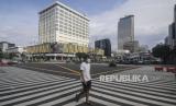 Warga menyeberangi jalan dengan latar belakang Gedung Sarinah di Jakarta, Ahad (20/3/2022). Setelah selesai menjalani renovasi pusat perbelanjaan pertama di Indonesia itu akan dibuka kembali pada Senin (21/3/2022). Sarinah kini mengusung tema community mall dan menjadi pusat perbelanjaan khusus Usaha Kecil dan Menengah (UKM) sehingga hanya akan menampilkan produk-produk lokal. Republika/Putra M. Akbar (FOTO : Republika/Putra M. Akbar)