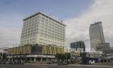 Kendaraan berhenti di dekat Gedung Sarinah, Jakarta, Ahad (20/3/2022). Setelah selesai menjalani renovasi pusat perbelanjaan pertama di Indonesia itu akan dibuka kembali pada Senin (21/3/2022). Sarinah kini mengusung tema community mall dan menjadi pusat perbelanjaan khusus Usaha Kecil dan Menengah (UKM) sehingga hanya akan menampilkan produk-produk lokal. (FOTO : Republika/Putra M. Akbar)