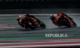 REPUBLIKA.CO.ID,LOMBOK TENGAH -- Pembalap Red Bull KTM Factory Racing Miguel Oliveira (kanan), pembalap Ducati Lenovo Team Jack Miller (kiri) memacu kecepatan sepeda motornya saat balapan MotoGP seri Pertamina Grand Prix of Indonesia 2022 di Pertamina Mandalika International Street Circuit, Lombok Tengah, NTB, Ahad (20/3/2022).