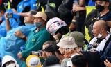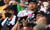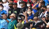 Seorang penonton berhasil menangkap helm yang dilemparkan pembalap Aprilia Racing Aleix Espargaro seusai balapan MotoGP seri Pertamina Grand Prix of Indonesia di Pertamina Mandalika International Street Circuit, Lombok Tengah, NTB, Ahad (20/3/2022). Aleix Espargaro memenuhi janjinya untuk melemparkan helm kepada penonton usai berhasil meraih jumlah pengikut di Instagramnya sebanyak satu juta orang sebelum balapan MotoGP pada hari Minggu (23/3). (FOTO : ANTARA/Andika Wahyu)