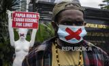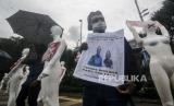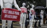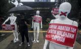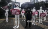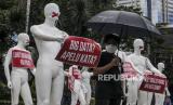 REPUBLIKA.CO.ID,JAKARTA -- Sejumlah aktivis berdiri di dekat manekin saat melaksanakan aksi di depan Mapolda Metro Jaya, Jakarta, Senin (21/3/2022).